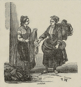 Que pensez-vous de ces paciegas si préoccupées de leur commerce ? Elles achètent de vieilles robes, de vieux chiffons à cette Basquaise. Avez-vous vu celle de droite ? Vous êtes surpris de ce balancement continuel ; elle fait un pas en avant, puis un en arrière : voyez le panier qu'elle a sur le dos. Sa compagne ne porte qu'un gros ballot de chiffons noirs; le fardeau de la première est plus précieux, car sur ses marchandises repose un gros marmot ; il est là aussi à son aise qu'il le sera demain dans la montagne, lorsqu'après les achats finis, sa mère aura regagné le pays.