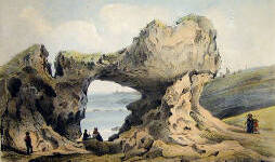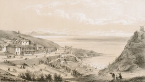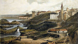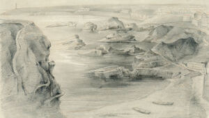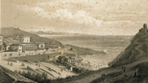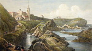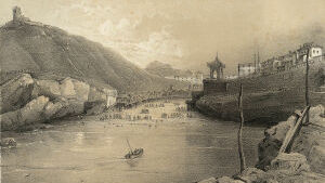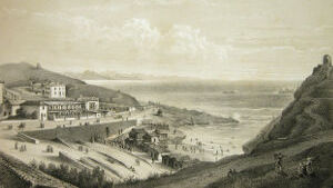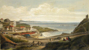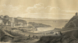 Ces ruines, sur la hauteur à droite, sont celles d'un château fortifié qui date de 1300; ses murailles se sont détachées de leur ossature pour s'arrêter, on ne sait comment, au milieu de leur éboulement. A gauche, cette vieille tour servait autrefois pour faire des signaux et rappeler les pêcheurs, quand venait le mauvais temps. Devant nous, ce bassin étroit formé de rochers bien caractérisés, constitue le Port-Vieux. Prenons ce petit chemin à droite, et allons nous reposer sur ces pierres qui forment la base de cette vieille tour; nous pouvons parfaitement voir l'ensemble du golfe, et cette foule de baigneurs et de curieux qu'attire l'heure de la marée. La côte des Basques, dont les longues falaises argileuses s'amoindrissent jusques vers ces petits groupes de rochers de Bidart qu'éclaire le soleil couchant, est un but de promenade pour les naturalistes. Remarquez ces voiles de pêcheurs qui se rapprochent lentement de la Bidassoa, derrière ces petits rochers que nos marins nomment les Deux Tombeaux et les Espagnols los Dos Hermanos (les Deux Frères), et ces montagnes qui s'abaissent à mesure qu'elles approchent du rivage et viennent se terminer par une bordure de rochers qui s'étend depuis Fontarabie jusqu'au cap Machichaco que nous voyons à l'horizon. A nos pieds, une mer profonde, avec ces tons d'émeraude que lui donne l'heure avancée du jour. […]
