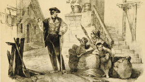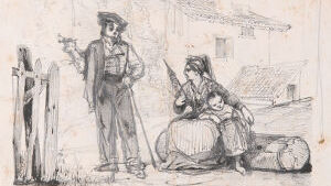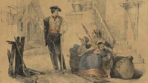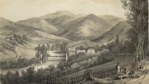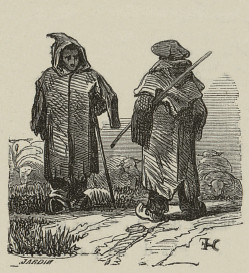 Remarquez ce jeune Basque cheminant la main passée autour de la taille de sa compagne : c'est sans doute sa fiancée ; et ce pâtre à la dalmatique noire, au capuchon pointu et aux ailes tombantes; ce charretier qui l'accompagne, chaussé de bas de laine brune dont la bordure s'élargit sur les sabots. Les costumes des jeunes gens qui les suivent sont plus élégants : berrets bleus, vestes de velours, espartilles et le maquila(1) national. Ces femmes avec leurs mantelets noirs se rendent â l'église. Tout nous dit que nous sommes parvenus aux premières assises de la montagne. Ce qui nous confirme plus encore que nous entrons dans les Pyrénées, c'est cette physionomie franche et ouverte qui vous annonce que vous serez le bienvenu sous le toit du montagnard. Cette hospitalité dont vous serez à même d'apprécier la cordialité, rappelle les mœurs patriarcales.