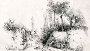 chemin creux, chien couché et un homme à chapeau haut-de-forme