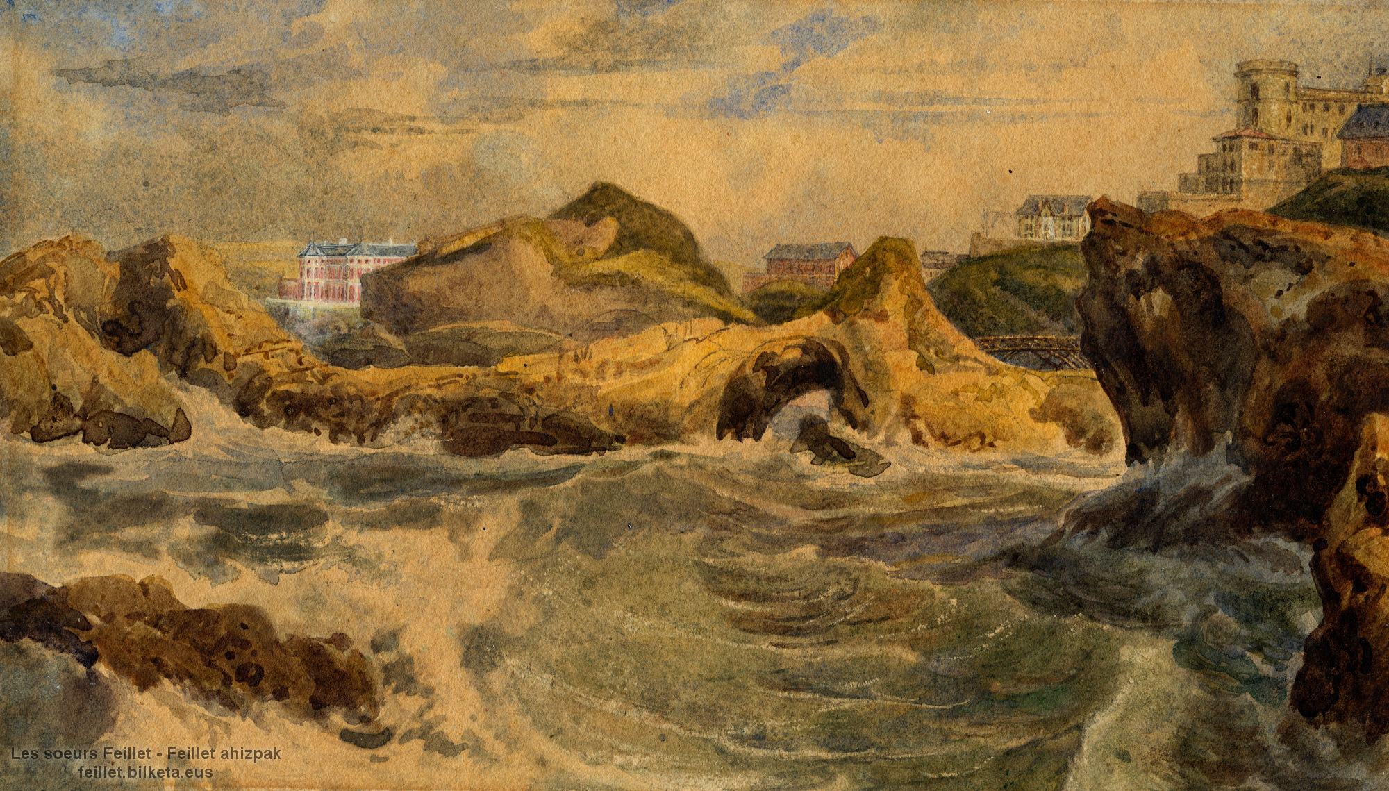 Les sœurs Feillet intègrent le monument à leurs compositions de la même manière que Charles s’attache toujours à faire la présentation historique des sites dont il conseille la visite. Hélène et Blanche accordent la même importance à la description d’une architecture qu’au pittoresque d’un costume ou d’un mode de transport traditionnel. A Passages, port de Guipuzcoa, qui fournit nombre de motifs à leur œuvre dessinée et lithographiée, les sœurs Feillet s’attachent à la représentation du Fort Isabelle et de la tour Saint-Pierre. A côté de Saint-Jean-Pied-de Port en Basse-Navarre, un ancien château des Templiers constitue le sujet d’une aquarelle pour Hélène. A Fontarabie, la citadelle et l’église Santa Maria de la Asuncion y del Manzano (XVe et XVIe siècles) offrent des motifs de prédilection aux deux sœurs.