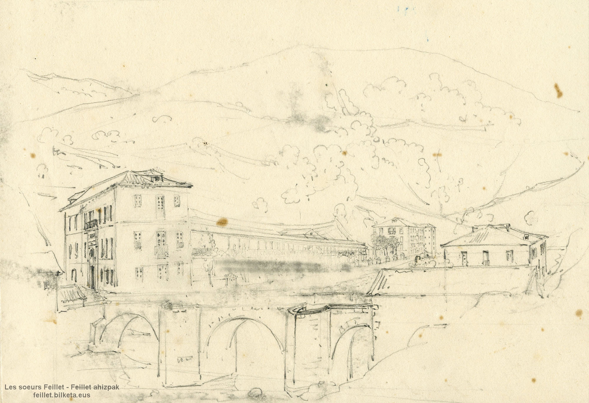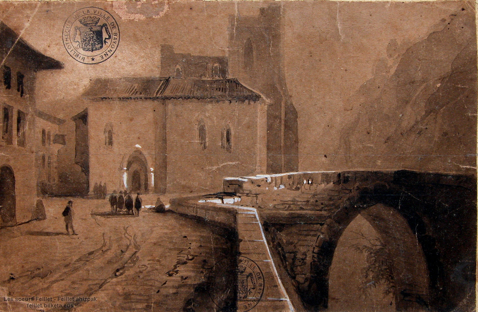 Dessin sur le motif, très détaillé, il s’agit davantage d’un dessin aux détails élaborés plutôt que d’un croquis (comme dans les exemples précédents). Sur la gravure, des personnages ont été ajoutés, donnant plus de profondeur au paysage. Admirez la richesse des détails du dessin : cyprès, à gauche du pont, berges de la Nive, dessin architectural du pont, avec ses quatre piliers rehaussés de blanc, afin de bien le mettre en valeur.